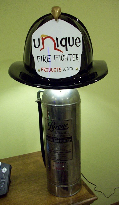 Lamps are made with used chrome extinguishers and our helmets for shades. Your choice of colors of the helmet and lettering on shield is included in the price of $450.00. We can also convert your extinguisher into a lamp. Email or call for details.